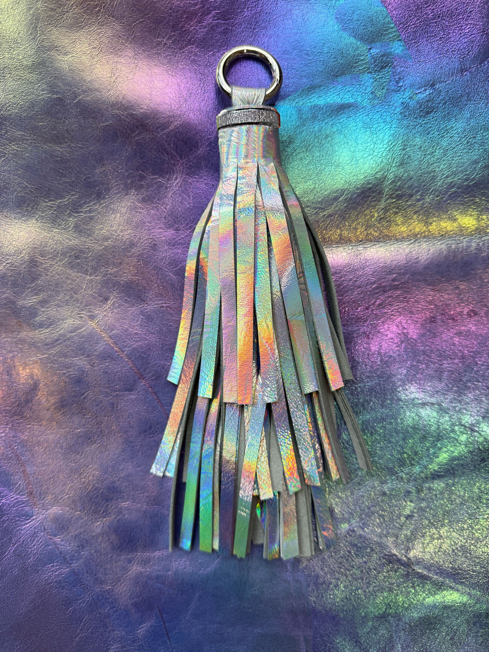 Holographic Iridescent Leather tassel, quality strong hardware, keyring tassel