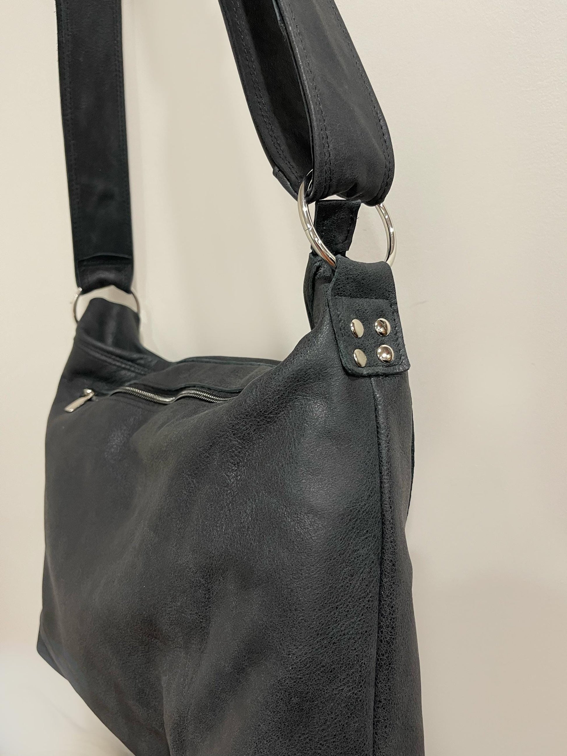 Distressed Black Leather Crossbody Bag with asymmetrical flap