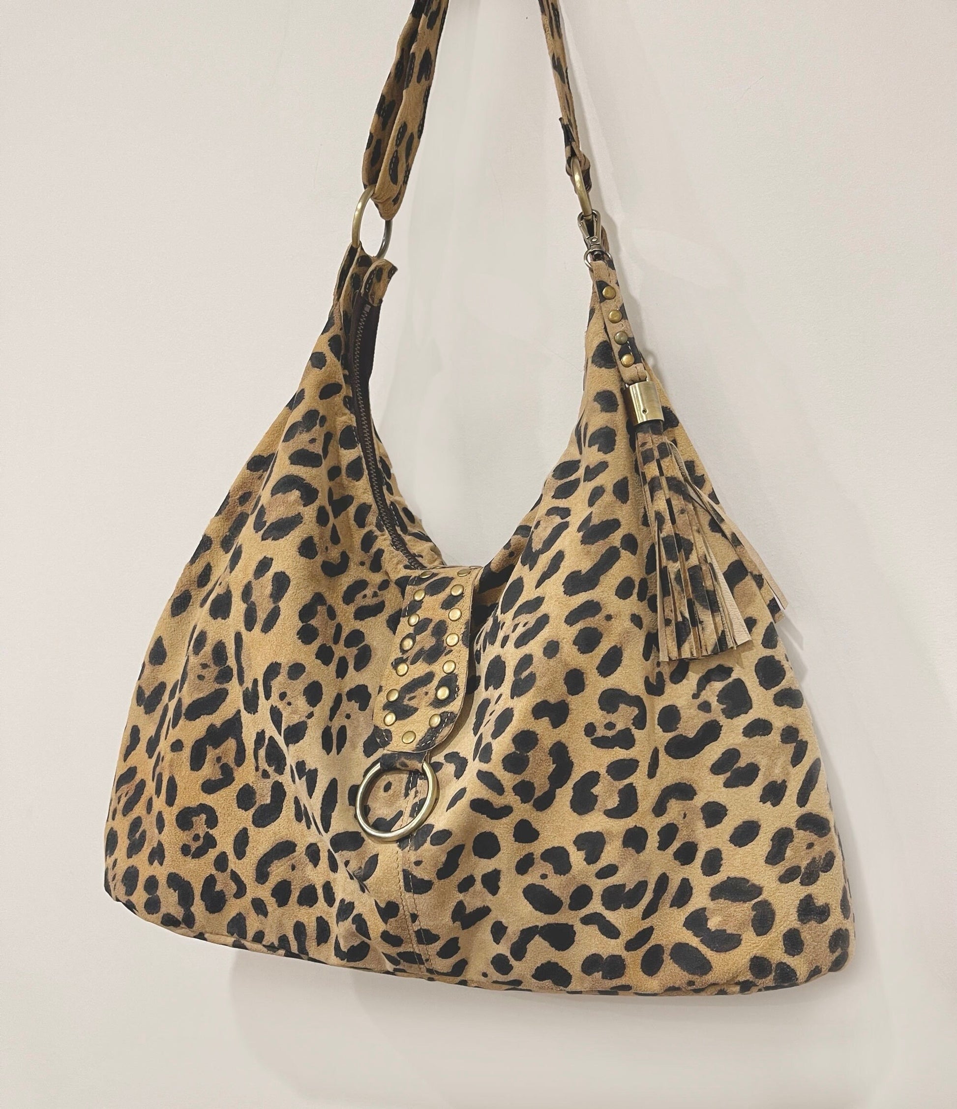 Leopard Print Leather Italian Hobo Bag, Suede surface