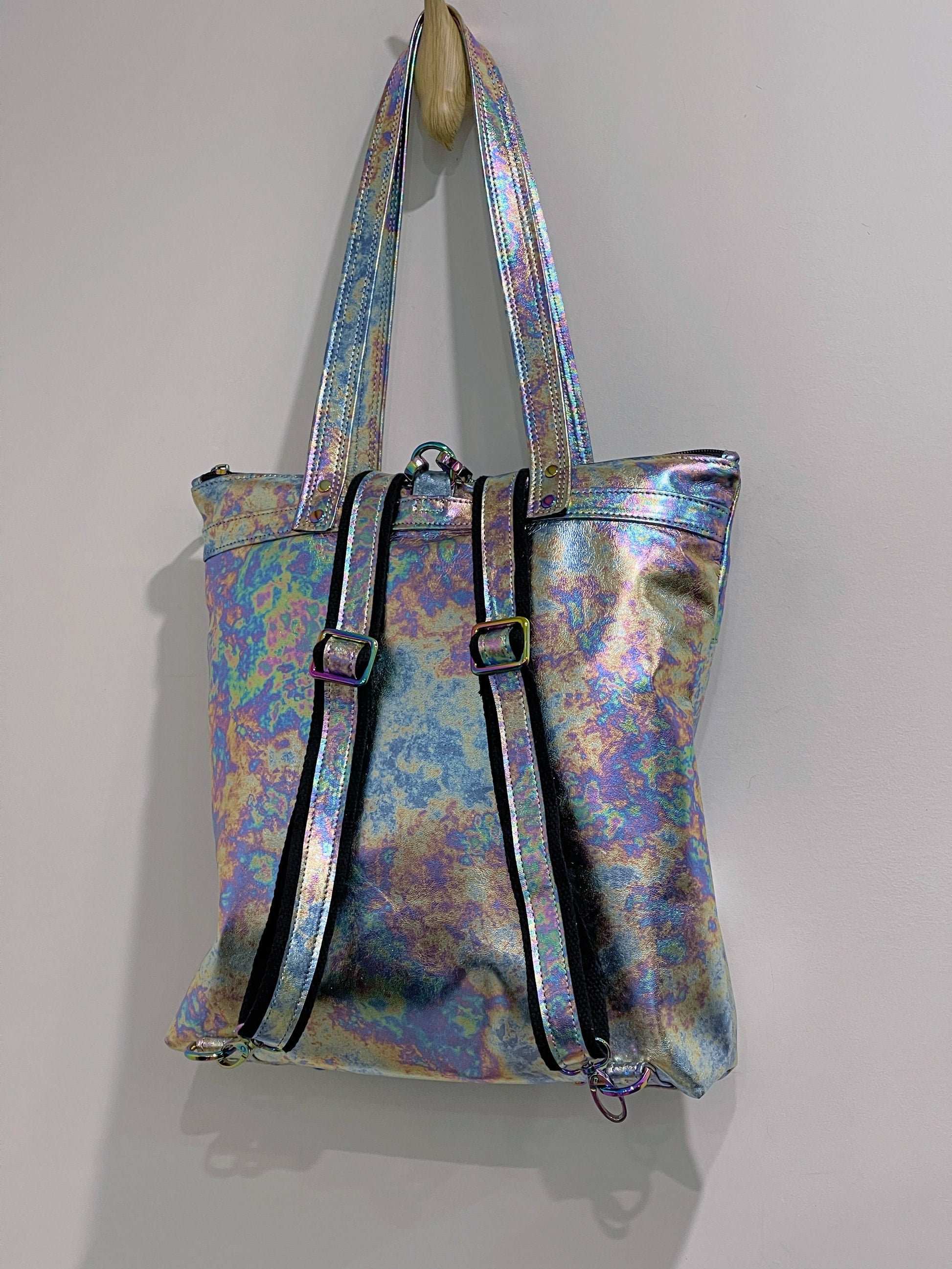 - Photos show metallic rainbow hardware. - Choose your backpack options: with tote straps, or no tote straps, or with top handle, or just the tote (with no backpack straps or attachment hardware0