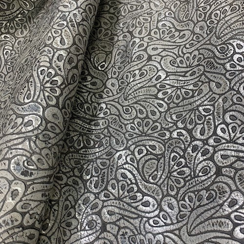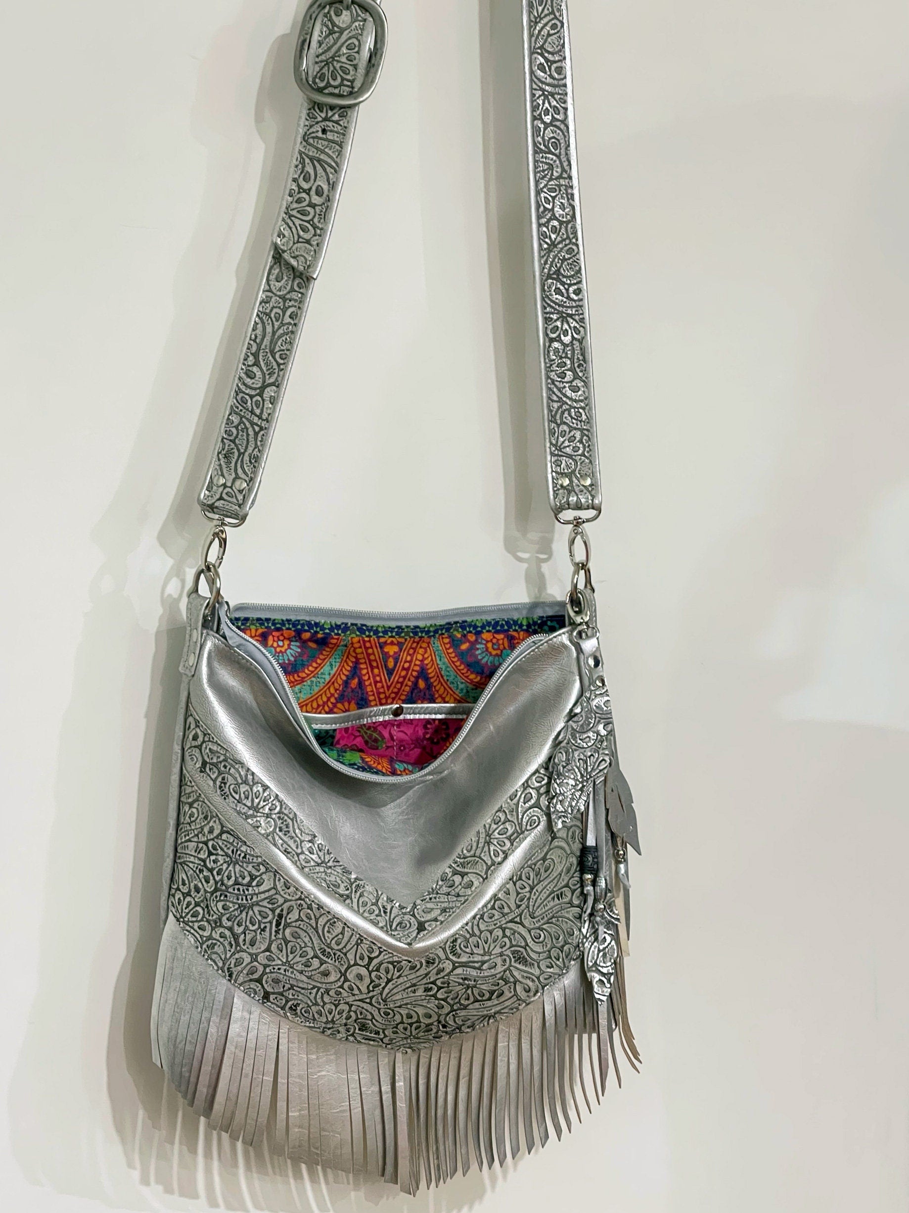 Metallic silver Leather Fringe Hobo Bag with featured tooled leather