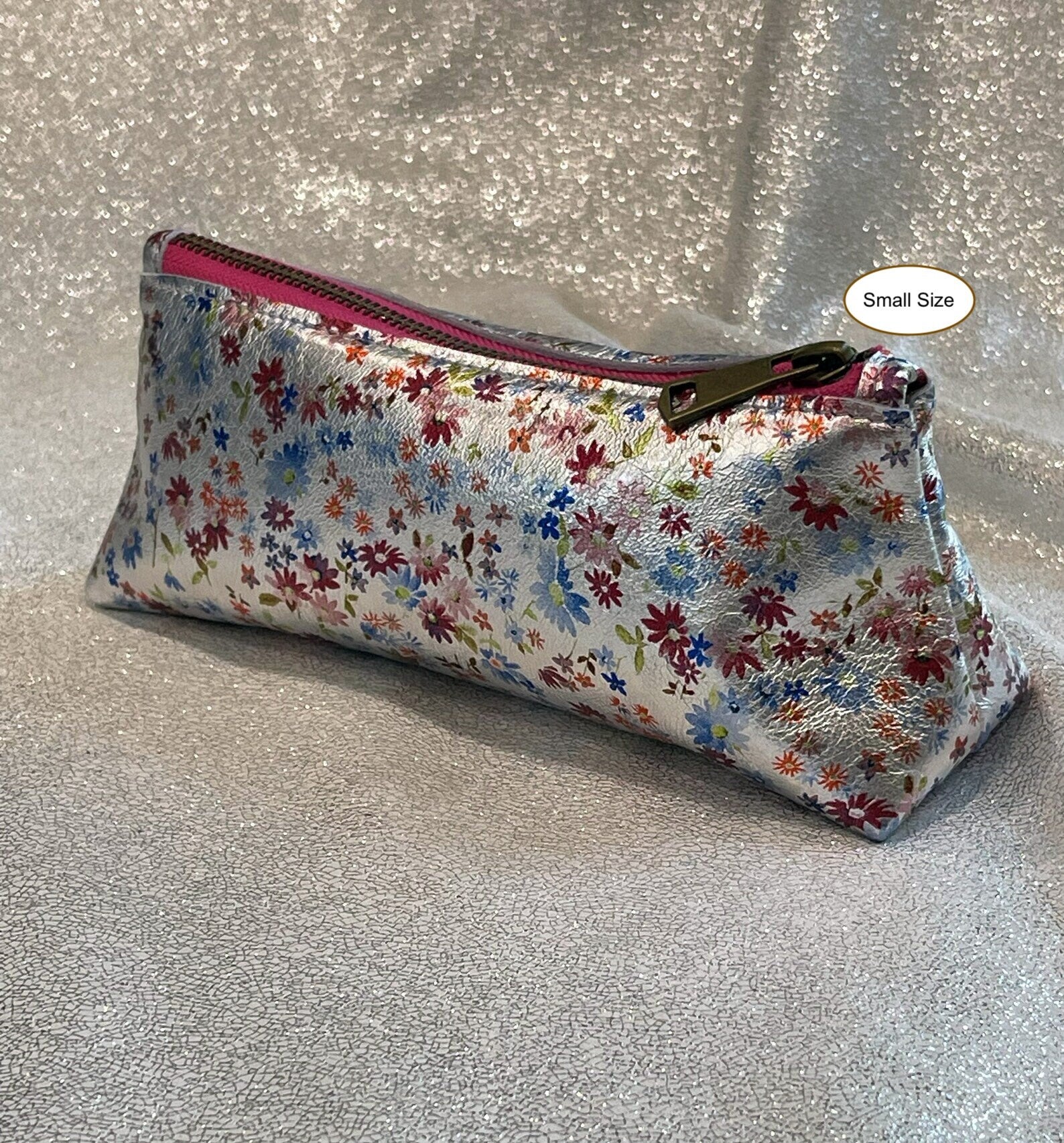 Small Metallic Silver Floral Leather makeup purse, Ditsy print