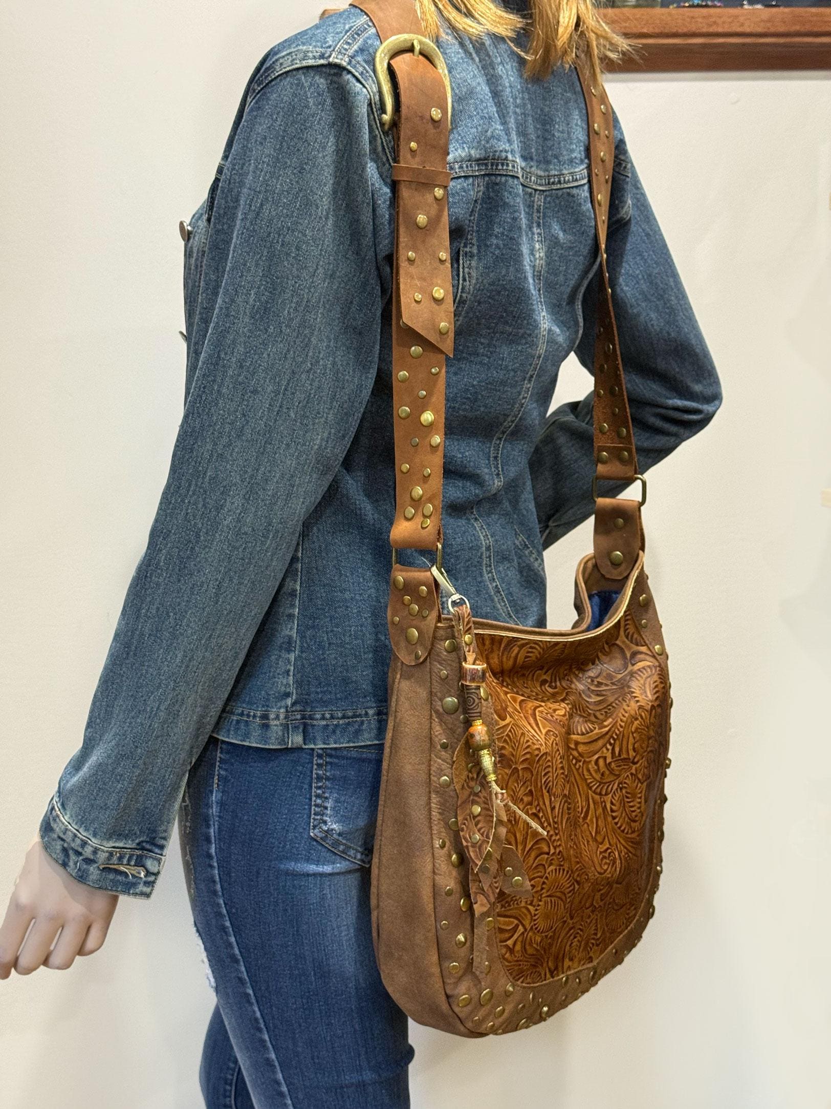 Studded Tooled brown Leather Hobo crossbody or shoulder Bag, 1 IN STOCK