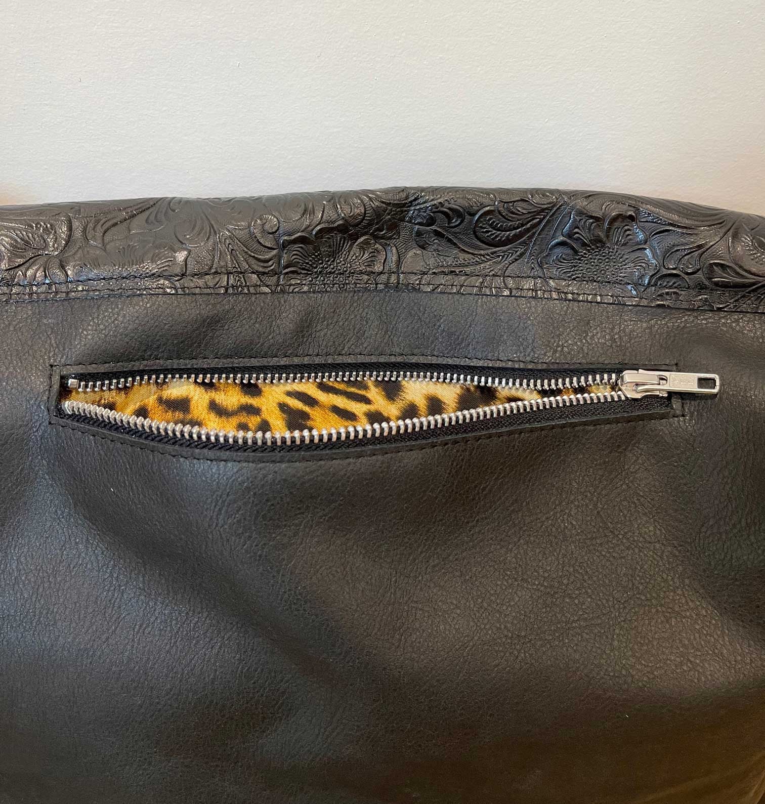 Soft Black Top Grain Leather Crossbody Bag with floral tooled flap