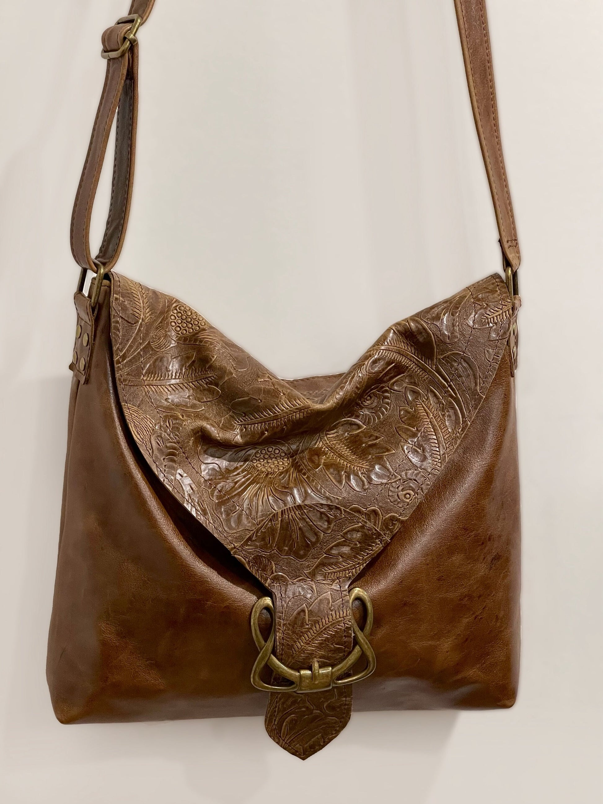 Tooled Brown Celtic Buckle leather crossbody with flap