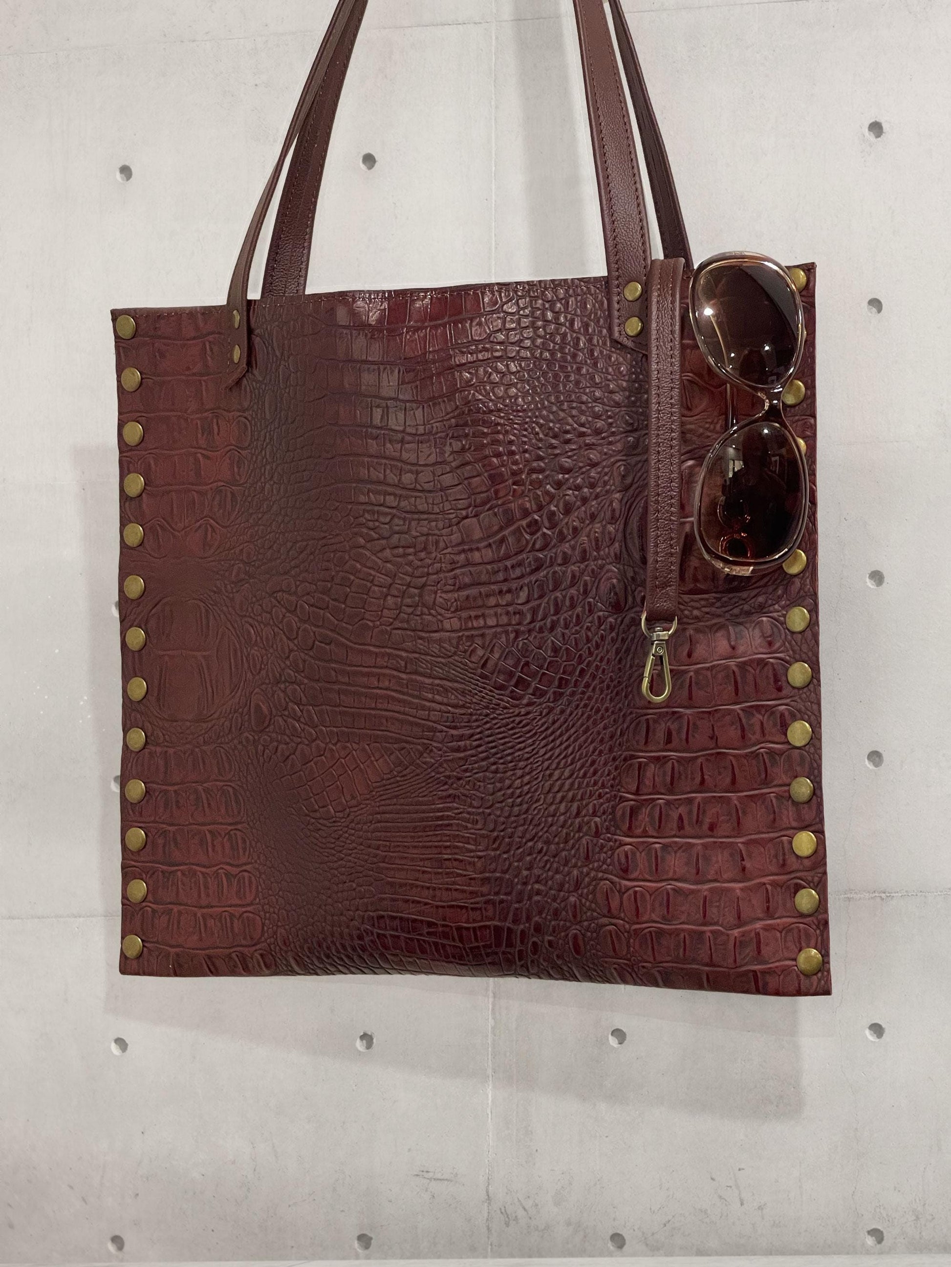 Tooled Embossed studded Burgundy Croco Leather Tote